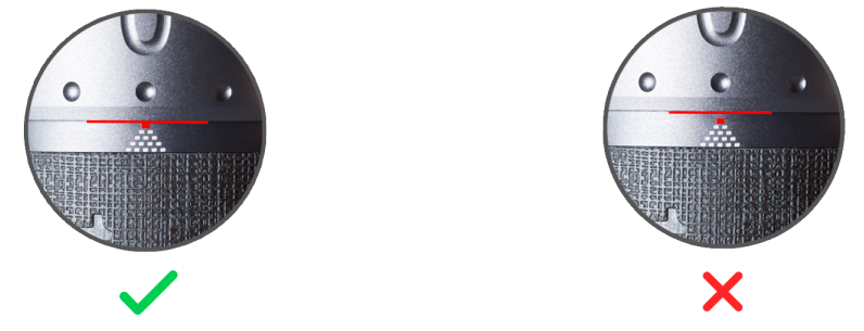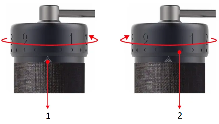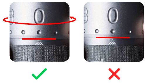 ![]() | Rikta in #0 med skalmarkeringen och botten kanten på justeringsrattens ring vidrör den första nivån av skalmärket. |