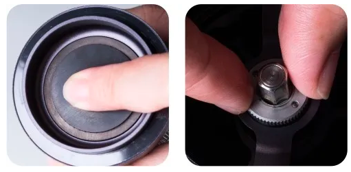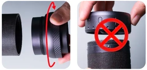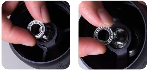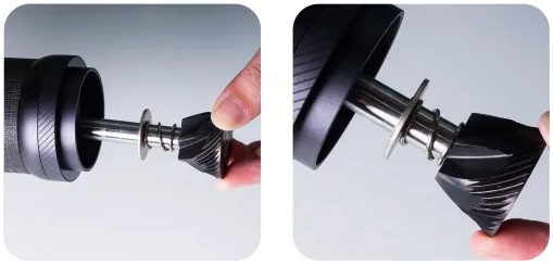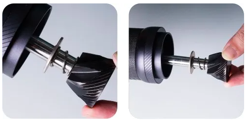 Vrid borrringsenheten framåt (vänd gängorna). Demontering av justeringsrattens ring föreslås inte. Rengör inte kvarnen med vatten. Rengöring med borste och blås rekommenderas. |