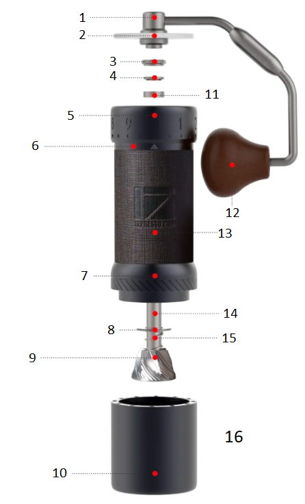 ![]() | Dra åt den räfflade vingmuttern för att kalibrera kvarnen medan du trycker på krosskålen från botten. Obs: Det är totalt fyra och ett halvt rotation räknat från startpunkten. Startpunkten kan vara annorlunda inom ±10 klick på grund av den styrka du drar åt muttern och ratten. |