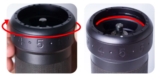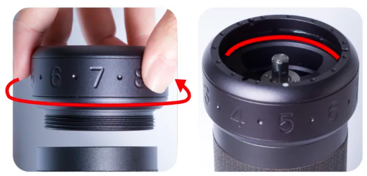 - Vrid på justeringsringen för att ställa in önskad malningsgrad. Visaren på ratten visar inställningen – högre siffror motsvarar grövre malning. Undvik att dra åt ratten för hårt för att förhindra att kvarnen fastnar.