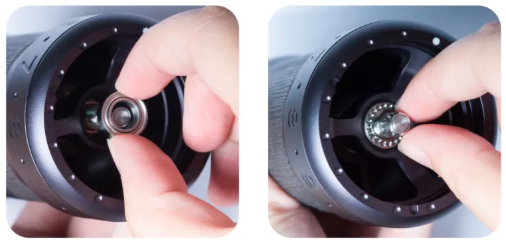 ![]() | Medan du trycker på borret, sätt tillbaka det övre lagret och övre lageröverfall (den prickiga sidan uppåt). Se till lageröverfallet är korrekt placerat. |