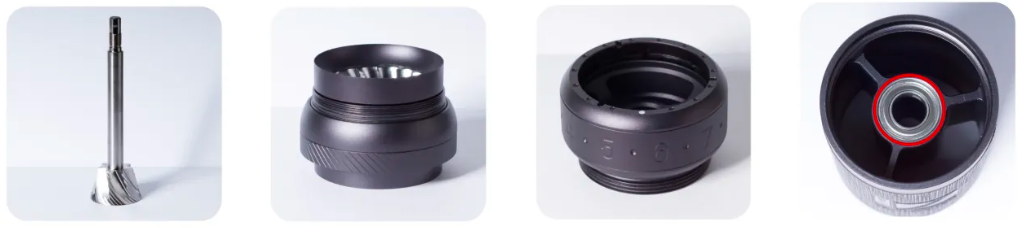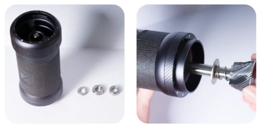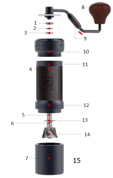 ![]() | 1. Räfflad tummutter 2. Övre lagerkåpa 3. Övre lager 4. Halkfritt silikonläder Illustrationen är endast för referens. Den faktiska färgen kan variera. 5. Central axel 6. Vår 7. Modellmottagare 8. Vevknopp 9. Hopfällbart handtag Tryck upp för att vika. 10. Justeringsring 11. Kropp 12. Burrringsenhet 13. Nedre lagerlock 14. Burr 15. Kapacitet för kaffesump: 35–40 g (beroende på bönsorten) |