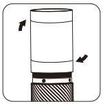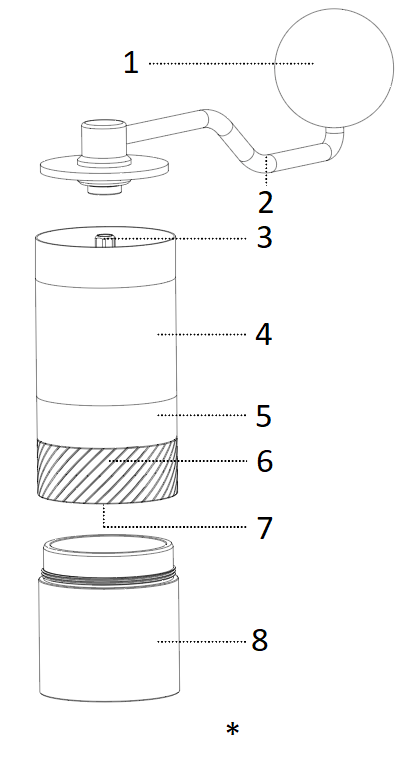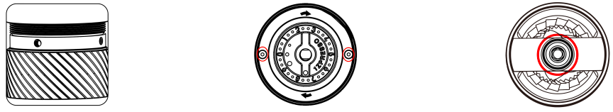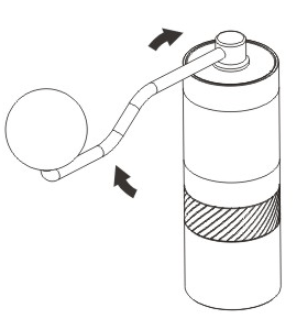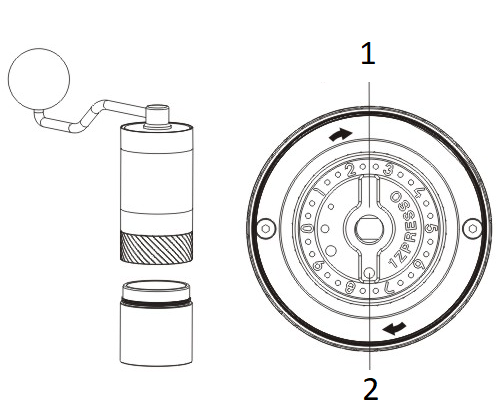 Alla 1Zpresso kvarnar kan demonteras utan verktyg. Montera och placera vevhandtaget ordentligt, stoppa det från att rotera och lossa det. justeringsratten moturs för att ta bort den. |