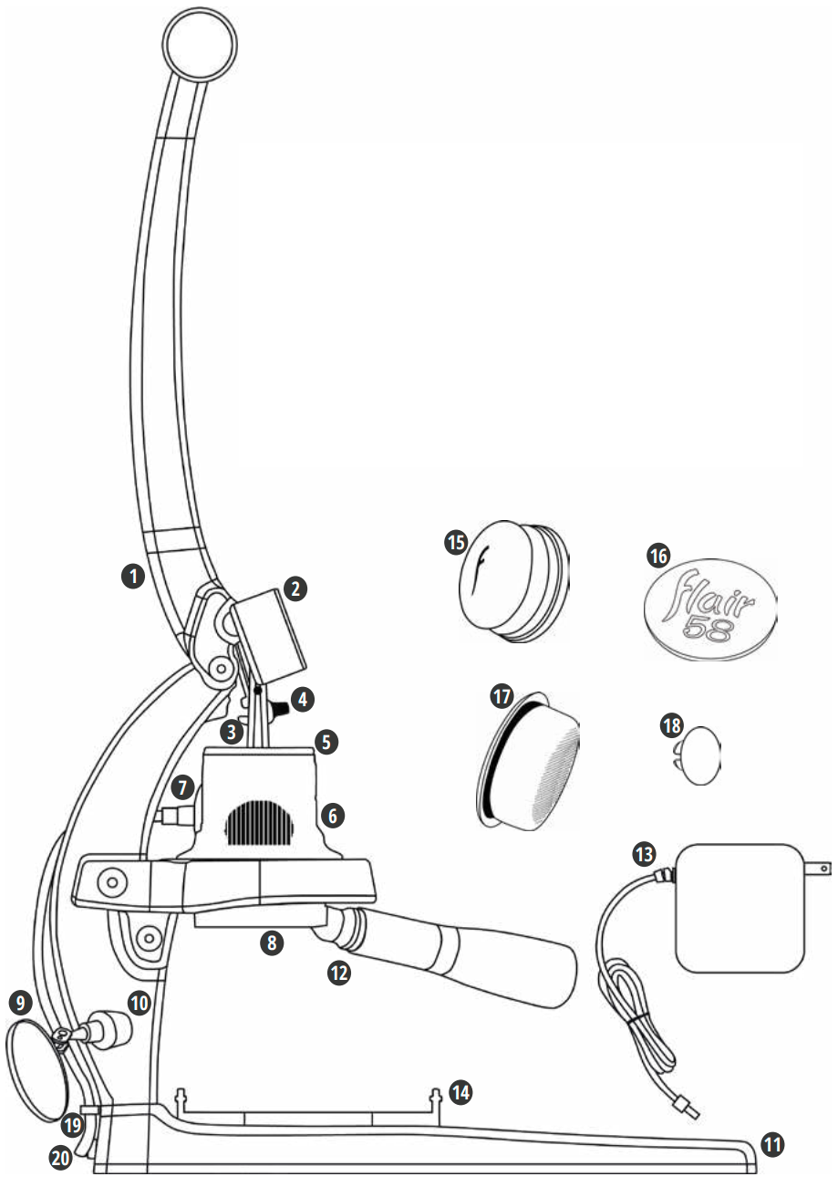 Nyheter: Flair 58 Plus 2 har ett förvärmningskontrollsystem som är helt integrerat i basen. Kabeldragningen har förenklats, med tandemutgångar bak, och strömförsörjningen är ett elegant väggfäste. Vad som behövs för att brygga: Flair 58 Plus 2 är en espressomaskin av Professional-kvalitet, vilket innebär att du behöver en högkvalitativ kvarn för att effektivt kunna mixa dina shots. Om du har några frågor angående detta, vänligen kontakta vårt team! | ![]() |