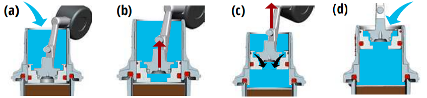 (a) Börja med spaken nedsänkt och fyll bryggcylindern upp till kanten med vatten. (b) Lyft spaken tillräckligt för att lossa skaftet och öppna ventilen så att vattnet fyller utrymmet under (vifta på spaken för att minimera luftfickor). (c) Fortsätt att höja spaken långsamt, så kommer vatten att rinna genom ventilen och in i bryggkammaren. (d) Fyll på bryggkammaren genom öppningen som görs mellan skaftet och kolven när spaken är helt upplyft.