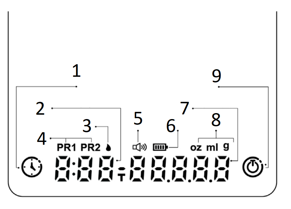 - Låg batterinivå: Blinkar när batterinivån är låg. Detta fortsätter tills LO visas, och sedan stängs vågen av automatiskt.