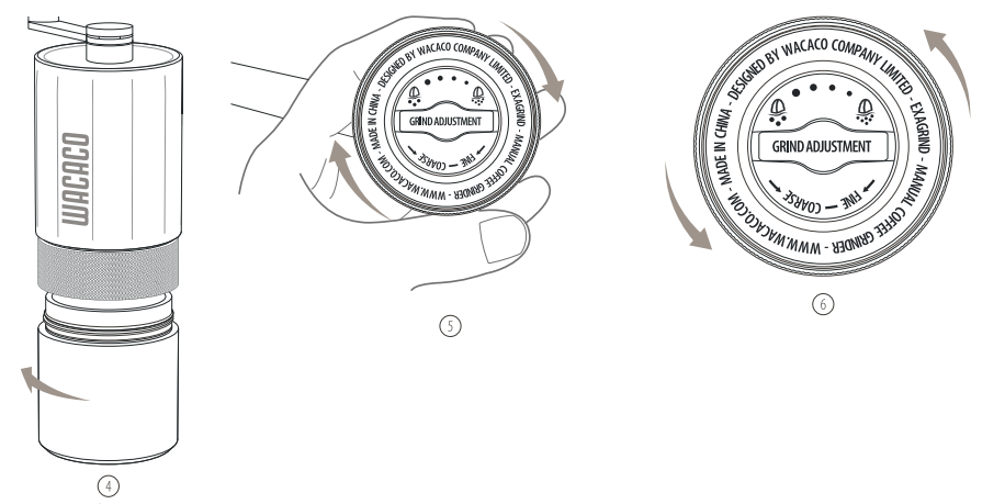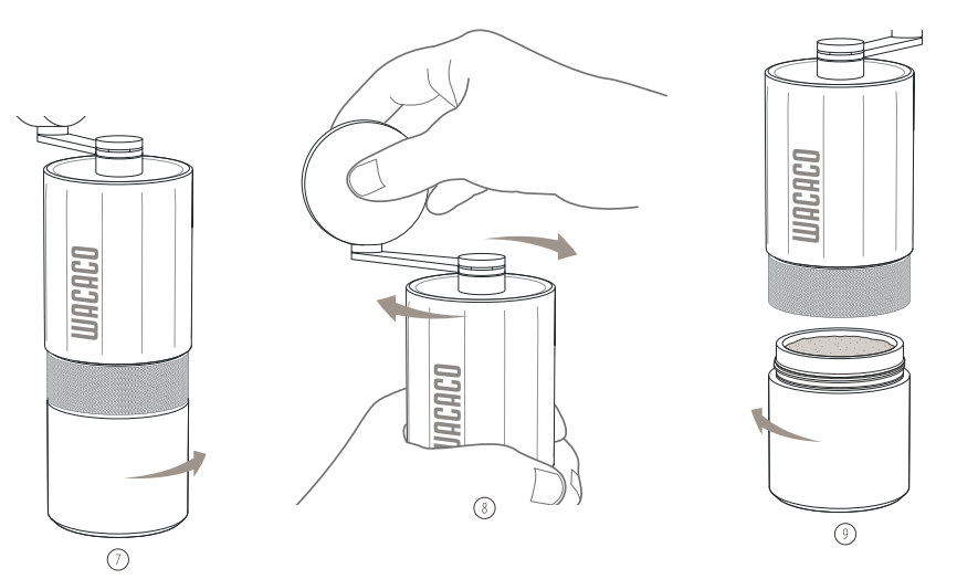 8. Håll huvuddelen i ena handen och vrid handtaget medurs med den andra handen tills alla bönor är malda.