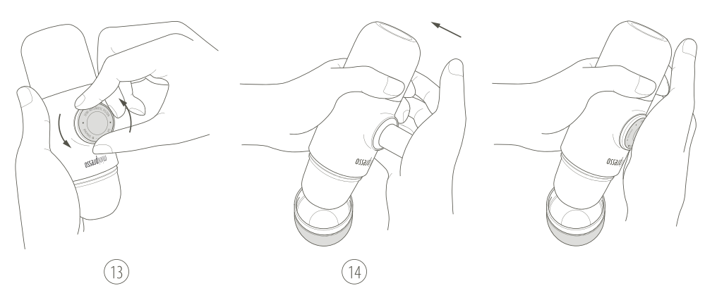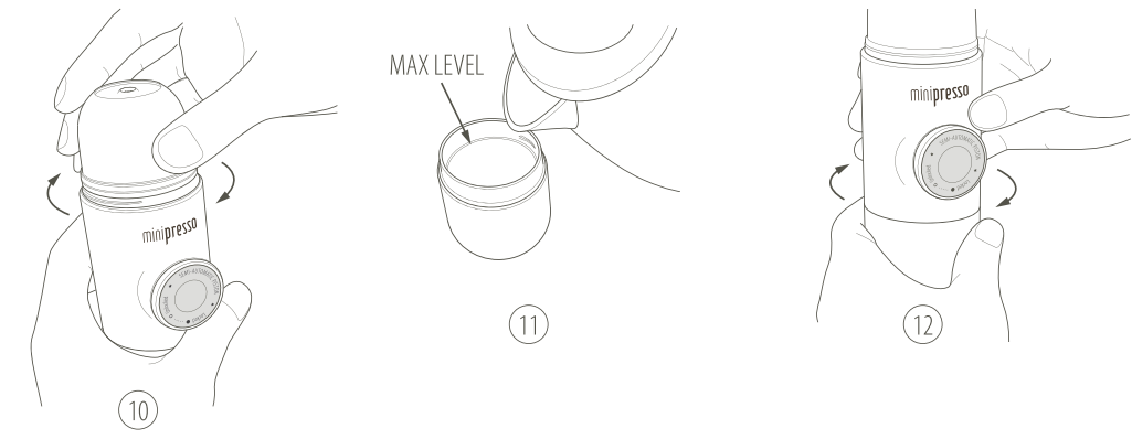 12. Skruva fast huvuddelen på vattentanken tills det tar stopp. Undvik att bränna dig. Hantera försiktigt.