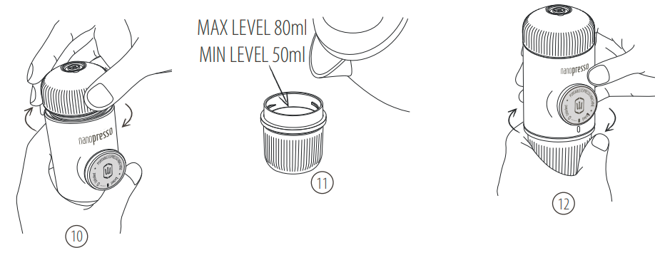 14. Håll NanoPresso med båda händerna, som visas ovan. Börja pumpa ovanför en kopp. De första 8 dragen byggs trycket upp. Pumpa långsamt tills allt kaffe kommer ut.
